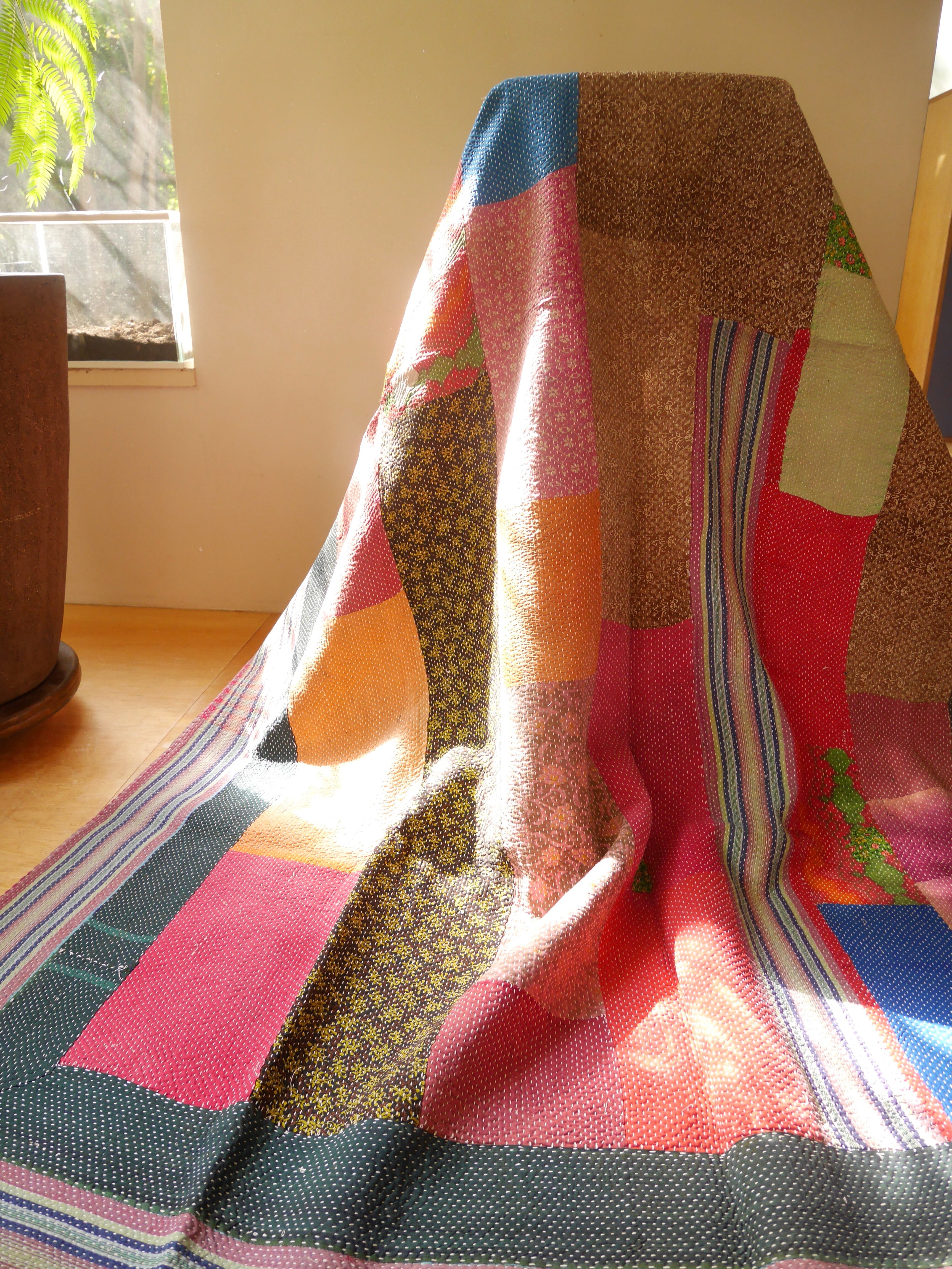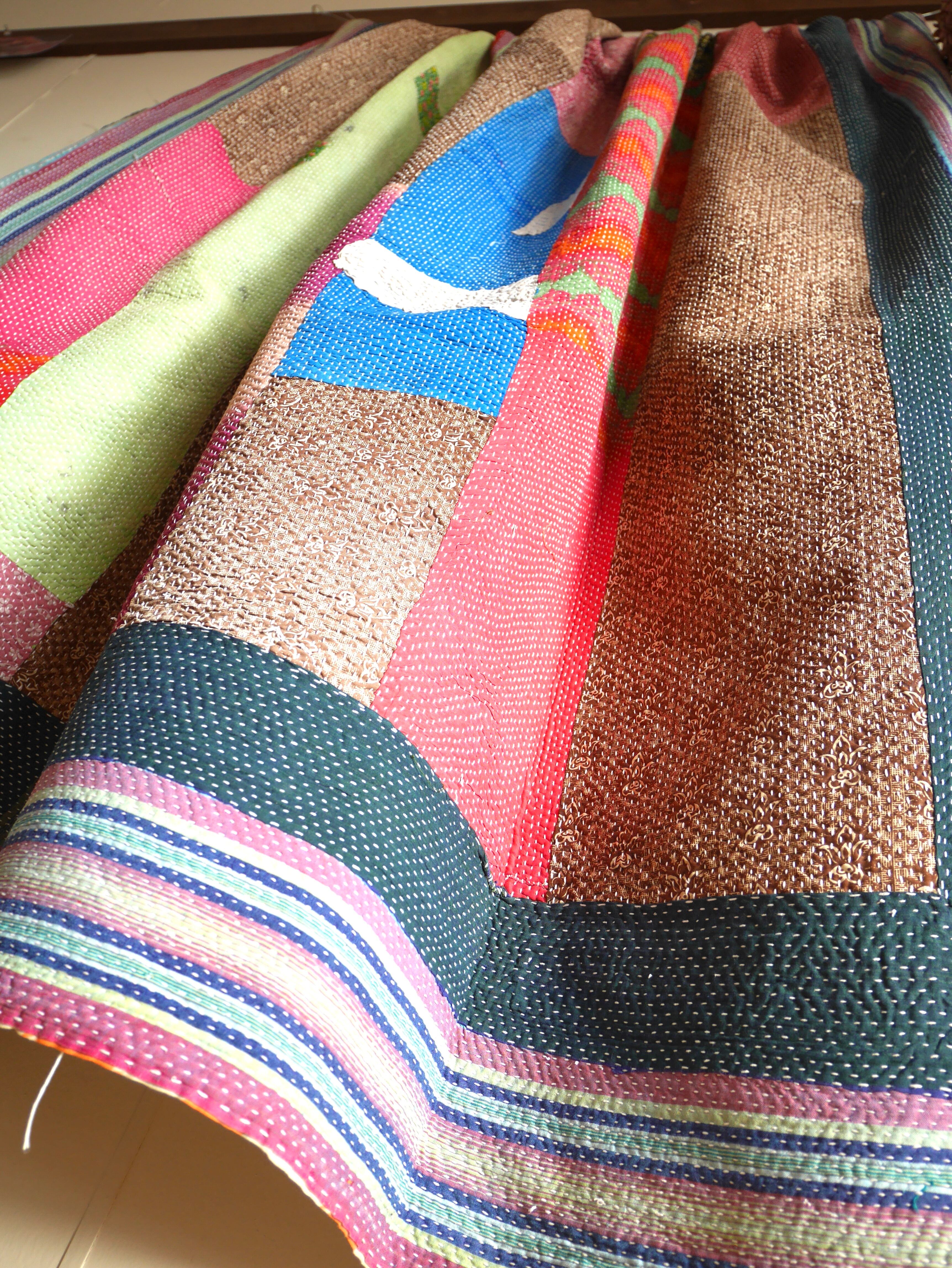 ラリーキルト/カンタとはインド、パキスタン、バングラディシュで長い年月をかけ受け継がれてきた伝統工芸品です。古くなったサリー、デュパタ、腰布などを幾重にも重ねてランニングステッチを施したキルト布はつくり手によって個性が活かされた一点ものです。