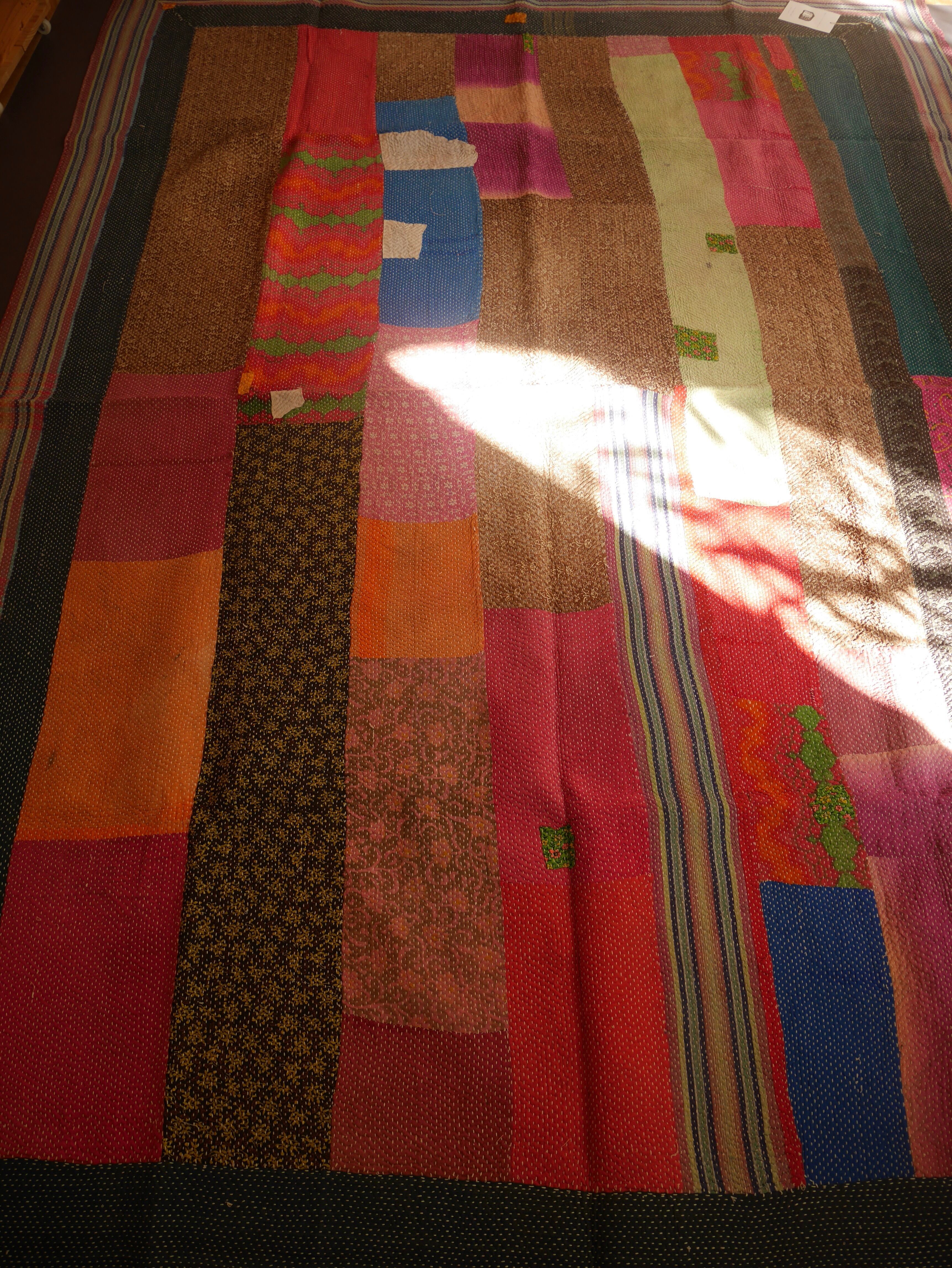 カラフルなパッチワークだけど、黒の縁取りで落ち着いた印象の一枚。ステッチもしっかりしてます。厚手なのでラグ向け。