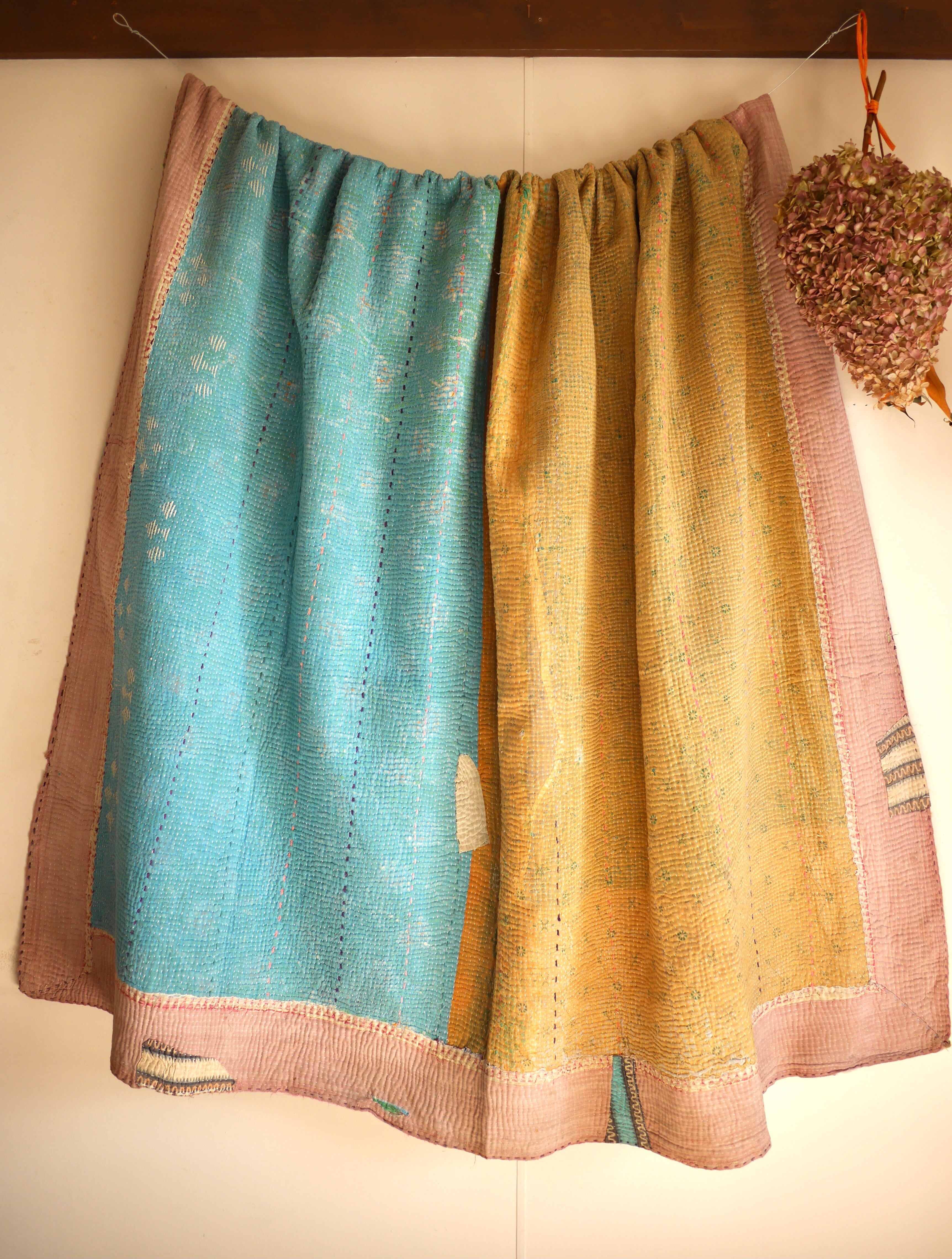 ラリーキルト/カンタとはインド、パキスタン、バングラディシュで長い年月をかけ受け継がれてきた伝統工芸品です。古くなったサリー、デュパタ、腰布などを幾重にも重ねてランニングステッチを施したキルト布はつくり手によって個性が活かされた一点ものです。