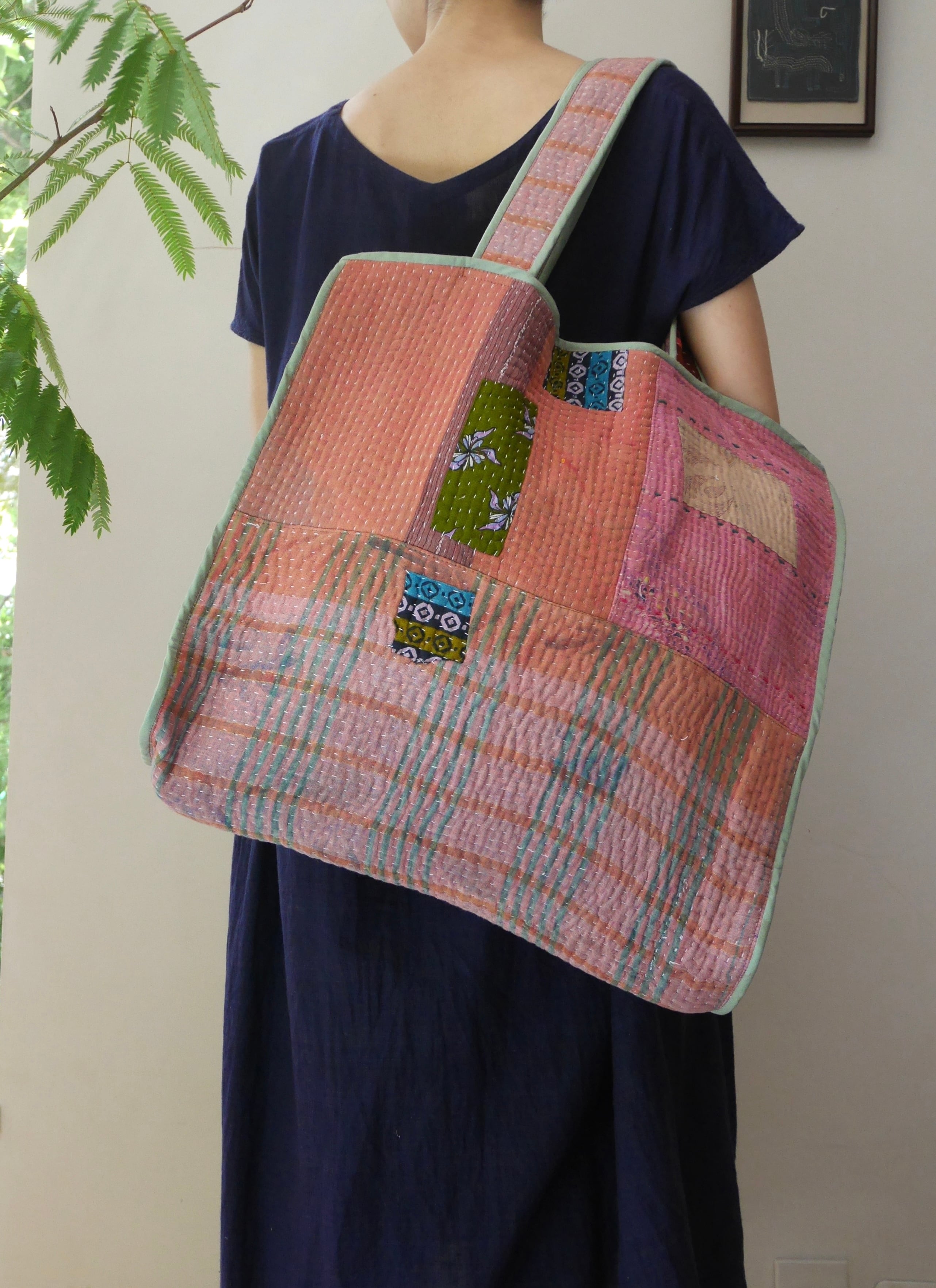 どっさり、たっぷり入る大きいサイズのトートバッグ。ステッチの入ったラリーキルト布を使っているので強度もあります。