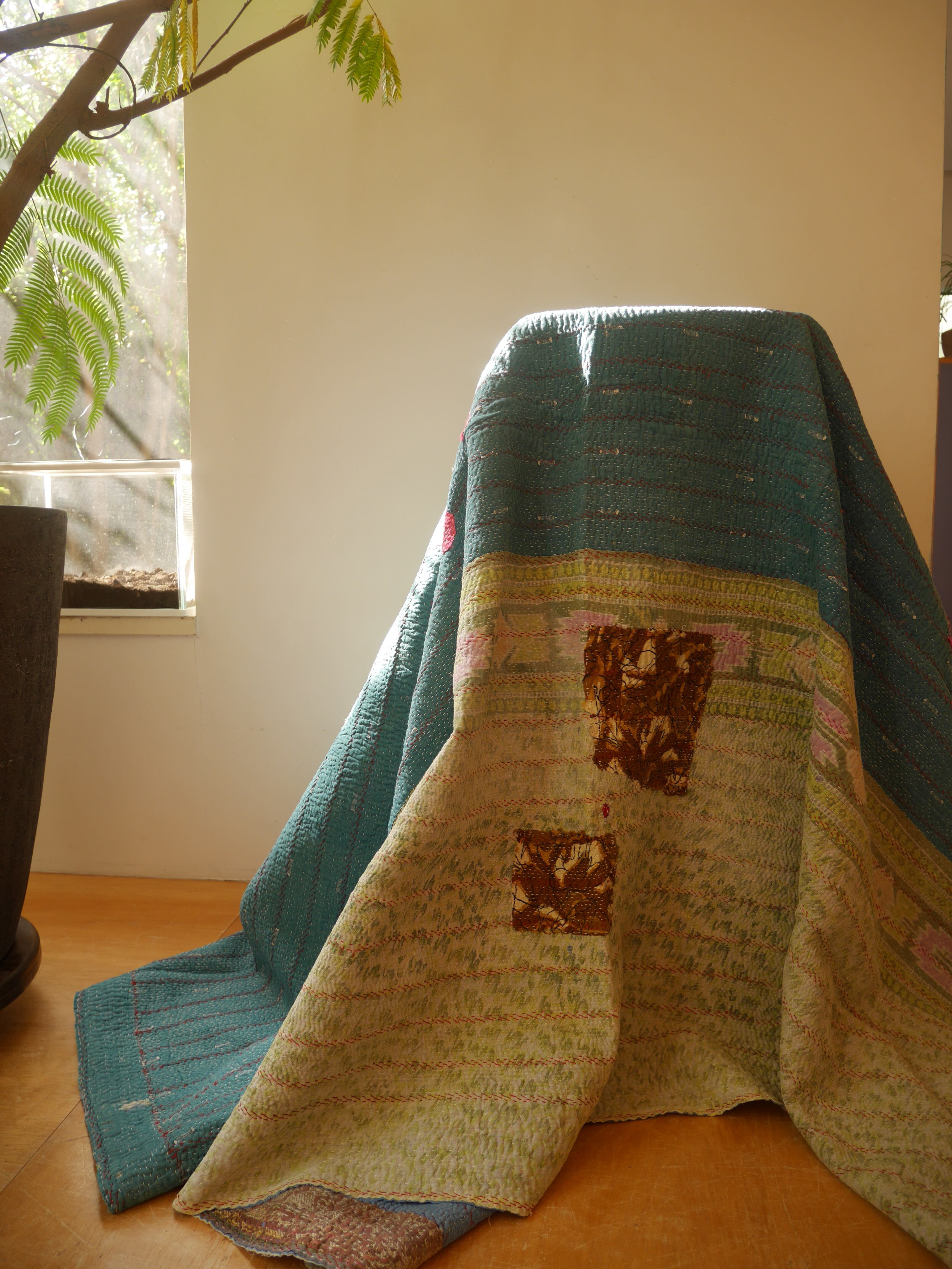 ラリーキルト/カンタとはインド、パキスタン、バングラディシュで長い年月をかけ受け継がれてきた伝統工芸品です。古くなったサリー、デュパタ、腰布などを幾重にも重ねてランニングステッチを施したキルト布はつくり手によって個性が活かされた一点ものです。
